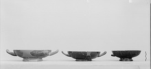 Description:   Mended from many fragments; one handle and much of rim and body missing; two rim and wall fragments do not join. Restored in plaster. Heavy moulded ring foot; rim offset on inside only.