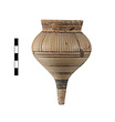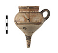 | Description: | Mended from several pieces; small chips missing. Plump pear-shaped funnel with plain rim, slightly flaring; slender tapering funnel-end. Vertical rolled handle on shoulder. Decoration in brown to red-brown glaze. The rim glazed outside, and for a short distance inside; the handle and the funnel-end glazed. On the shoulder, a broad zone of verticals; on the lower wall groups of narrow bands. Light buff clay. | |