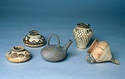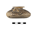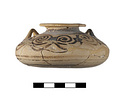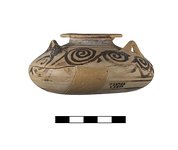 | Description: | Mended from several pieces; fragments of wall, two handles and parts of lip missing. Lightly domed alabastron, with broad rim, turned slightly down. Neck and rim glazed to top of shoulder; below this, a single band of glaze; on shoulder, running spirals. Handles glazed. On underside, groups of concentric circles. Light buff clay, pink at core. Dark brown glaze. | |