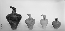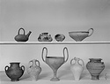 Description:   Intact. Small amphora with high shoulder; the lower wall tapering sharply; bottom concave beneath. Narrow neck; a ring around the shoulder at base of neck. Band handles, arched, from below lip to edge of shoulder. Neck spreads out to form open spout in front, a plain oval lip behind.