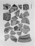 | Description: | From the wall of a very large closed pot. Part of neck and back of centaur(?), right, looking back(?). Behind his neck, rosette and swastika filling ornament; over his back, part of a small animal clutched in his hand(?). Clay pink to buff; buff surface; glaze black to brown. | |