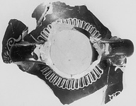 | Description: | Part of shoulder and neck, with both handles; nothing of rim preserved. Fragment of a neck amphora, probably Panathenaic shape. Short thick handles springing from moulded ridge around middle of neck. Tongue pattern below ridge; above it, laurel(?) wreath. Below handles, double palmettes with volutes. A little of the figured decoration is preserved on one side only; the top of a wreathed head, left. No relief contour. Inside glazed to base of neck. | |