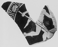 | Description: | Two joining sherds preserve part of floor and much of low ring foot. Satyr running right, holding a thyrsos in his right hand. The head of the thyrsos is drawn over the maeander border. Partial relief contour, the foot ring glazed inside and out; the space within reserved, decorated with a circle and dot at the center. For the style cf. a cup in CVA Oxford, II, 7; noted there is a stemless cup from the same hand. Date, 480-470 B.C. With the Agora fragment came a handful of black glazed and semi-glazed sherds, discarded, looking late archaic: first, or possibly into second quarter of 5th c. LT and MC. | |