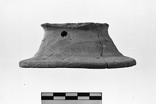 | Description: | Fragment a) preserves part of the lower wall of the bowl, with a little of the horizontal flange and one handle. Fragment b) not certainly belonging, comes from a kernos of the same fabric and about the same scale as a). It preserves a section of the flaring base, pierced with two holes. Russet clay: micaceous household ware fabric. No certain remains of color. Fragments of a few similar kernoi in tray, one possibly painted. | |