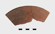 Not a pot inscription. Probably written on a sherd of which original edge preserved at left on inside, at right on outside. Same pair of names on both sides.