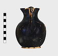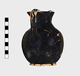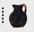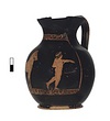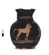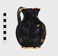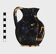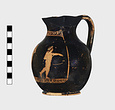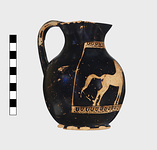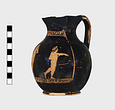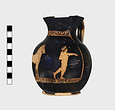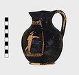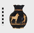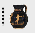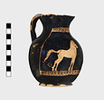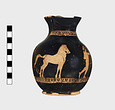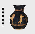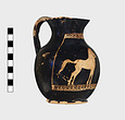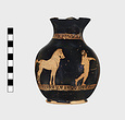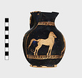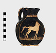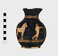 | Description: | Part of lip and chips from foot missing; otherwise intact. Trefoil lip. A boy, nude, walking right, leading a horse by a long rein which hangs over his bent left arm; in his outstretched right hand he carries a large wreath and a bunch of small branches. Fillet in added clay; rein, wreath and branches in white. Egg and dot border above and below panel; reserved line at sides. Glaze somewhat grayed and worn. No relief contour. | |