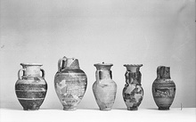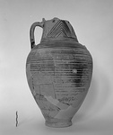 | Description: | One handle, rim missing. Ring foot, double rolled handles. Body banded solid at base and shoulder. On neck concentric triangles with double wavy lines and hourglass motifs to either side. Pinkish-buff clay, brownish glaze. | |