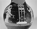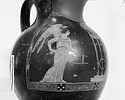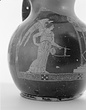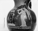 | Description: | Mended from several pieces. Large part of mouth and neck and smaller pieces from body missing. Handle broken and repaired in antiquity. Panel framed by a band of enclosed palmettes above, of chevrons at the sides and maeander and checkers below. In the panel: two Nikai on each side of a large tripod standing on a two-stepped base; fillets hang down from its top. The Nike at the left holds a lyre in her left hand, the other hand is akimbo. She wears a girdled peplos with long overfold, bracelet on both arms, necklace. The Nike at the right holds an untied wreath in her left hand; right hand raised. Girdled peplos with kolpos(?) bracelets, necklace, wreath. White for the fillet, wreath, bracelets and necklaces. Dilute glaze for shading in garments and large shining surfaces of tripod. Relief contour for faces, tripod, lyre. Good glaze; buff-red clay. Underside of foot had a red wash of which only traces remain. Inside neck glazed; the rest of the inside covered with dilute glaze. | |