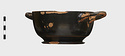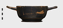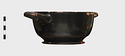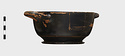 | Description: | Complete except for chips; mended from three pieces. Band of ovules surrounded by palmettes on floor. Good black glaze, a little worn. Bottom reserved, with glazed circle near center, through which are scratched several concentric circles. | |