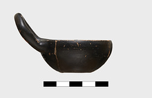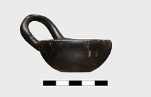 Description:   Small piece of rim and wall missing. Small bowl with plain rim and small flat bottom; attached at the rim and rising high above it, is a large handle, shaped something like skyphos handle.