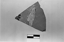 Description:   From the wall of a large closed vase. Human figure moving right: the right leg from mid-thigh to ankle, and the left heel. In the field behind the figure, a solid rosette, incised; below, a brown band on which the figure stands. The leg is outlined in brown to black glaze, somewhat peeled, and filled in whith white paint. The glaze of the rosette is black and lustrous.
