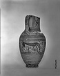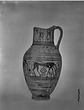 | Description: | Neck and one handle missing. Long oval body, band handles looping out. Very slightly flaring ring foot. On neck, a panel enclosed by three lines on each side. A) Two marching hoplites with round shields and two spears. Shield devices: a whirligig; a line circle inside a dotted circle. Parts of helmet crests and raised arms. Heads missing. B) Three marching hoplites, all carrying two spears. The left hand one has a small round shield with dot circle device, the others wear tunics with zigzag ornaments and a fringe of oblique strokes. Ends of helmet crests preserved. Heads missing. Handle zone reserved. Under missing handle the start of a lattice ornament. On handle, horizontal bands and St. Andrew's cross. Under handle, hanging rays flanked by bands. In the rest of this handle zone, standing spirals. Below, a zigzag band enclosed by three lines. In figure zone, grazing horses with stroke manes, below horses, large diamond and facing spiral patterns. Other filling ornament here and in neck panel, vertical and horizonal zigzags. Banded below, with one zigzag zone. Solid glaze on and above foot. Dull brownish-black glaze. | |