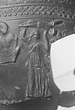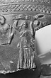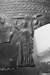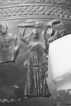 | Description: | Several joining fragments preserve nearly all the rim, with part of the wall, and the profile complete except for the medallion. Scraped groove below rim and around medallion. Rim zone: double spirals below veined leaves; then guilloche. Wall: large scale figured zone with mythological scenes and fillers of Erotes, masks, etc. Calyx: five zones of small veined leaves. Thick dull black glaze, fairly firm. | |