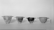 | Description: | Several fragments put together in two main groups give the foot with part of the lower wall, and a little of the rim and upper wall, also one handle. Restored in plaster. Low ring foot. Below rim, straight strokes, then narrow horizontal bands, then solid glaze to the foot with two reserved bands. Thin pale buff fabric; glaze fired red and considerably peeled, especially on interior. Protocorinthian. | |