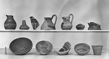 | Description: | Mended from many fragments; restored in plaster; handle missing. Squat oinochoe with slightly trefoil mouth. Flat bottom. Streaky black to brown glaze, not reaching to bottom. | |