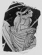 Youth squatting, facing, both knees up, a cloak around his waist, a fillet with long ends around his head; he looks right, head upturned, and listens to the sound of the lyre which he plays.