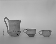 | Description: | Chip from rim broken off and repaired and lower part of handle missing; otherwise intact. Restored in plaster. Flat-bottomed one-handled cup with plain vertical lip. Glaze and decoration as P 24299 (ΚΤΛ 371). ADDENDA P 24299: Poor brownish-black glaze on lower wall outside, on inside, and for bands on inner and outer edge of rim, also for a pair of crossing bands on the outside of the handle. On the wall, to either side of the handle, an irregular vertical band sets off the handle space. Shattered and remended; some lip fragments missing [February 1957]. Restored in plaster [February 1959]. | |