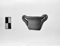| Description: | Complete. Strap handles from rim to base, carelessly applied. Pink-buff clay. Roughly made on wheel. Unglazed. Miniature Votive Cup. | |