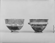 | Description: | Handles missing; about a quarter of the rim and much of the wall and foot restored in plaster. Mended from many pieces. Spreading ring foot; S-shaped sides with slightly flaring rim. On one side, the start of a handle. Immediately above the foot, a zone of rays. A little above the middle of the sides, a band of chevrons. Horizontal bands: one at outer edge of lip, two above and below the chevron, two above and one below the rays. On the underside of the foot, inside the foot ring, two concentric circles. Red for the horizontal bands and the concentric circles and for five pairs of concentric circles on the interior. Resting surface and underside of foot reserved. | |