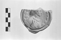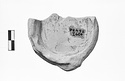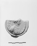 Description:   Preserved is part of the bottom of a plate, with an inset medallion above, and a ring foot below. On the medallion is the bust of a draped figure, facing right, wearing a laurel wreath. The medallion is framed by a large wreath around the bust, and a deep groove setting off the medallion. The top of the figure's head is missing.