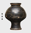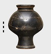 Black glaze outside, except beneath, and inside to base of neck. Reserved and scraped lines set off foot and neck mouldings. Inside a little dilute wash only.