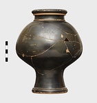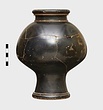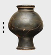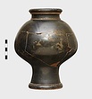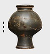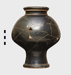 Description:   Mended from a number of pieces; complete except for small bits. Flat bottom, with a depressed disk at the center; base moulded in two degrees; no string-lugs; no flange for lid; short neck, neatly profiled; heavy rounded rim.