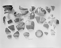 Description:   Mended from many pieces; one handle, piece from mouth, fragments from walls and chips from foot missing.