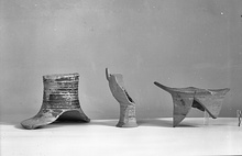 | Description: | Mended from two pieces; cracked. Hollow flaring base. Concave bottom of open bowl, glazed inside. Outside, broad, widely spaced bands. Pinkish-buff clay; glaze much peeled. White surface. Scratches on inside probably intentional. | |