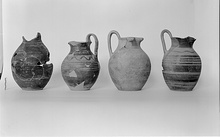 | Description: | Neckless oinochoe. Mended from many pieces; trefoil mouth and handle missing. Footless. Painted over all. Worn glaze. | |