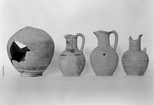 | Description: | Neck and handle missing. Ring foot. At base, broad bands with narrow banding above. Coursing hounds on shoulder. Red glaze, much worn. | |