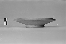 | Description: | Broad rim divided by grooves into three ridges of which the innermost is the highest. Interior slope, rim to center, a triple-curved line. High ring base, mesomphalic. Buff, micaceous clay; inside painted irregularly with thin black. | |