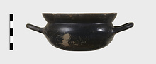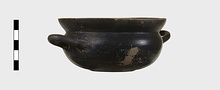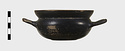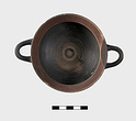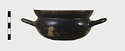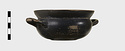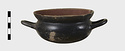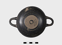 | Description: | Part of one handle and fragment of lip missing. Offset lip. Two horizontal handles. Small flat bottom. Inside of lip reserved and decorated with added red. Bottom reserved with small black circle. | |