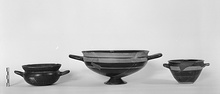 | Description: | Fragment of rim and body missing. A small cup with moulded rim and flat bottom. Reserved: handle zone, band above bottom, and bottom. Thin glaze, carelessly applied. Subgeometric survival. | |