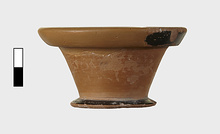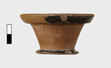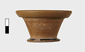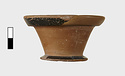 | Description: | About half rim missing. Spreading foot. Red inside lip. | |