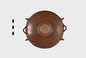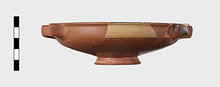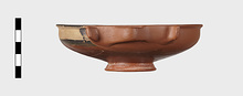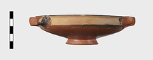 | Description: | One handle, much of other and fragments of rim and body missing. Similar to P 24981 (ΣΑ 3089), but the handles glazed, and a reserved disk, in which two red circles, at center of floor. Glaze for the most part fired red. Cf. Agora XII, no. 1208. | |