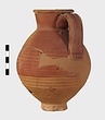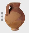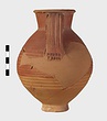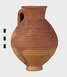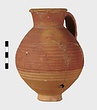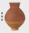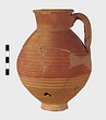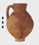 | Description: | Fragments of body missing. Restored in plaster. Small ring foot; ovoid body; round mouth. Horizontal ribbing around middle of body. Graffito on shoulder: <graphic> Dull red on upper half. | |
