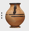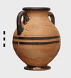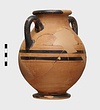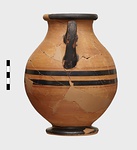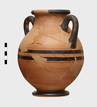 | Description: | Fragments of body and piece of mouth missing; restored. Rolled rim and rising handles; spreading foot. Body reserved with thin glaze wash. Black glaze for mouth and inside neck, handles, foot, and a pair of lines around middle of body; above and below these lines a narrow red line. | |