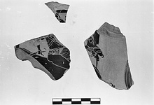 Description:   Fragment from an open pot, preserving the stub of a vertical handle. Head and chest of a horse, right. Part of another representation. Rosette between.