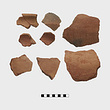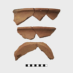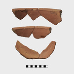 | Description: | a) Shoulder fragment with handle, continuous line with neck. b) Part of flowing flattened rim. Other pieces of plain base, rim, body. Heavy micaceous clay. Coarseware. | |