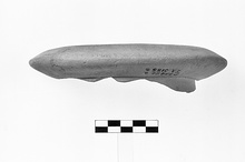| Description: | One fragment preserves part of rim with angular mushroom lip (this fragment may belong to P 25424). A second large fragment preserves most of lower body, with neatly collared toe, deeply depressed beneath. Clay pink with light gray core; buff surface. | |