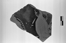 | Description: | Wall fragment from bell krater, handle attachment at left. Torso and lower part of head of bearded satyr, to right, carrying lyre. Egg pattern around handle. Good glaze inside; partial relief contour. Micaceous pinkish-buff clay. | |