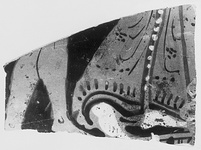 Description:   Wall fragment from bell krater, preserving lower parts of male (at left) and female (at right) figures, to right above decorated band. Woman wears elaborate decorated skirt. Applied white used for woman's feet, row of dots on skirt; originally overlaid with yellow.