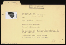 | Description: | Rim and wall fragment. Three zones: above, alternating dolphins(?) and shellfish(?); middle, large vine pattern; below, leaf(?). Pinkish-buff clay; black glaze. | |