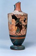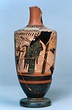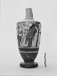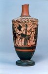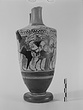 Description:   Mended from many pieces; the lip entirely missing and the handle save for its upper attachment. Strengthened with plaster at the back and on the shoulder; pieces missing throughout the body. Palmettes and a row of short strokes on the shoulder; at the top of the figured panel a zigzag band; below it a black band with red line and a reserved band. A moulded ring at the top of the foot, which is unglazed beneath.