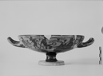 | Description: | Mended from many pieces; missing part of both handles, part of the foot and pieces from the rim and body. Inside, a small medallion outlined by three concentric circles of thinned glaze. Within the medallion, an eagle with very large spread wings, facing. The decoration on sides A and B outside is essentially the same but because the handles were not set on the same axis there is room for one figure more on side A than there is on side B. A. Five figures, from left to right: a maenad running left; a satyr pursuing her; a draped figure seated on a stool facing right and holding out a wreath toward Dionysos, who reclines on a couch, left. Behind him also left, a second satyr holding out a smaller wreath. Beneath the figured zone three lines of dilute glaze, the upper serving as ground line. Further down, a reserved band. B. As A, save that the first figure is missing, and the satyr is chasing only the handle of the cup. Reserved: a narrow stripe inside the lip, the insides of the handles, the outside of the foot, its resting surface and the upper part of the stem on the inside. Pink wash on the foot; orange wash over the clay-colored surfaces. The glaze dull and poor on the inside; somewhat better on the outside; scanty and careless incision. Red for spots on the eagle's tail; on the exterior for beards, tails, garment stripes, and a band along Dionysos' couch. Traces of white also on A, on garments and the god's wreath. | |