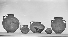 | Description: | Small fragments missing throughout. Restored in plaster. Plump body, ring foot; mouth rather irregularly shaped. Micaceous ware. | |