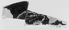 | Description: | Mended from two pieces. Perhaps a bit of the medallion border, and a reserved circle, at the upper left corner of the fragment. Head of youth right is preserved to the middle of his eye. In front of him, in the field, part of an uncertain object (bag?). Full face eye; reserved wavy hairline; relief contour for brow and object in field. Red for the boy's wreath. | |