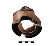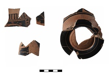 | Description: | Mended from many pieces; most of the base preserved and the full circle of the bottom of the cup above it. At the bottom of the cup a reserved band with 'rays' each consisting of a single relief line; above this band, a figured zone with reserved ground line and above it, traces of four(?) feet. Spreading ring foot, reserved inside, the reserved part decorated with two black concentric circles between two red ones. A circle of added red also on the bototm of the black glazed foot. A reserved line at the upper edge of the foot, outside, and a scratched line at junction of foot and body. Relief contours for the feet. | |