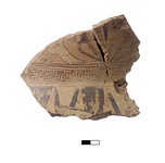| Description: | Three joining fragments give part of neck and shoulder of large amphora. On the neck, a foot, in outline, right; then a floral motif. Band of zigzags below. On the shoulder, inscribed triangles. White for the foot inside its outline. | |