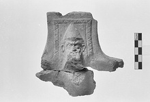 | Description: | a) [= Φ 791] Two joining fragments make up lug with grotesque face on inner surface, in relief: pointed cap and beard. b) [= Φ 1033] A second head from the same brazier, chipped at upper corner and at end of beard; somewhat burned. Micaceous, unglazed clay. | |